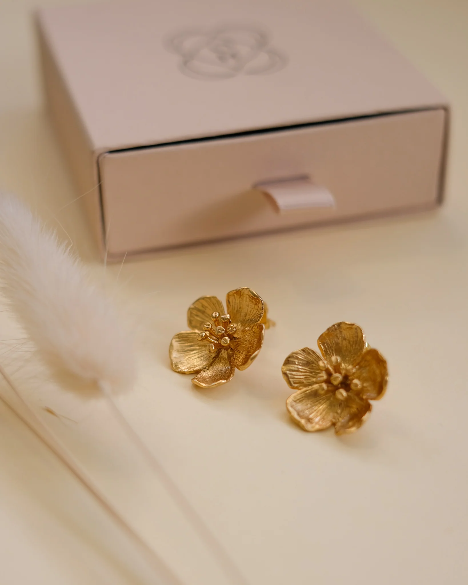 A charming floral design gives these gold stud earrings a touch of soft elegance. Plated in 21ct gold, these flower earrings have a gorgeous textured finish and are perfect for everyday wear. Ear posts are plated on sterling silver
